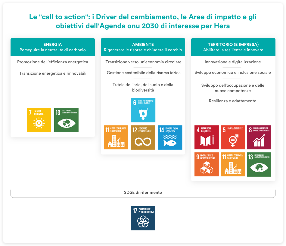 Questi sono a loro volta collegati agli 11 Goal dell’Agenda Onu e agli obiettivi Hera per lo sviluppo sostenibile che abbiamo individuato come prioritari in relazione ai business gestiti.