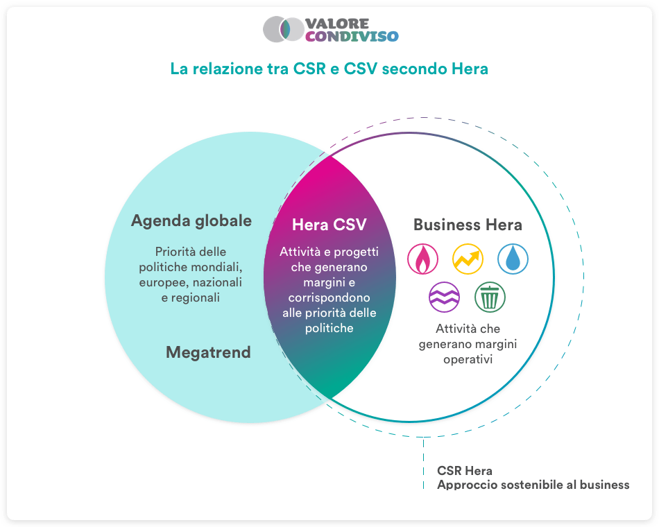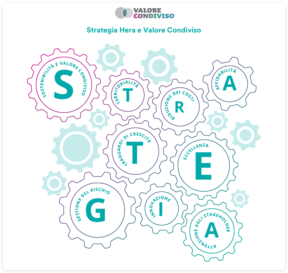 Per il Gruppo Hera, la creazione di valore condiviso è frutto di un approccio olistico legato a tutte quelle attività e progetti di business che generano marginalità economica ma al contempo rispondono alle nuove sfide imposte dall’"agenda globale", ossia le "call to action" imposte dalla normativa, da quella internazionale fino a quella locale, che indicano la nuova direzione della sostenibilità.